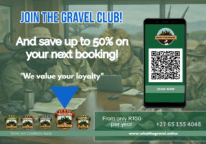 So head on over to your nearest What The Gravel Partner, book a stay directly with them, and register as a What The Gravel Member to start earning Bushbucks™. Membership is only available from our Partners. You cannot get it anywhere else.