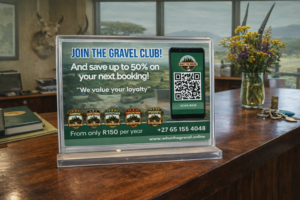 Properties & Business join as partners (Gold, Platinum, or Diamond tiers) and earn Bushbucks™ every time a guest signs up for membership via their own unique QR code or link at reception using our Magicard. And take advantage of our promotional campaigns exclusively distributed to What The Gravel Members.